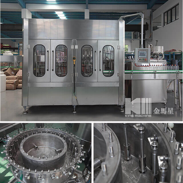 Машина в основном используется для розлива газированных напитков. Он сочетает в себе ополаскивание, наполнение и укупорку в одном автоматическом корпусе, подходящем для ПЭТ или других пластиковых бутылок. Принята технология розлива изодавления (изобарометрическая), позволяющая наполнять более эффективно и стабильно с большей производительностью, чем машины того же уровня от других.